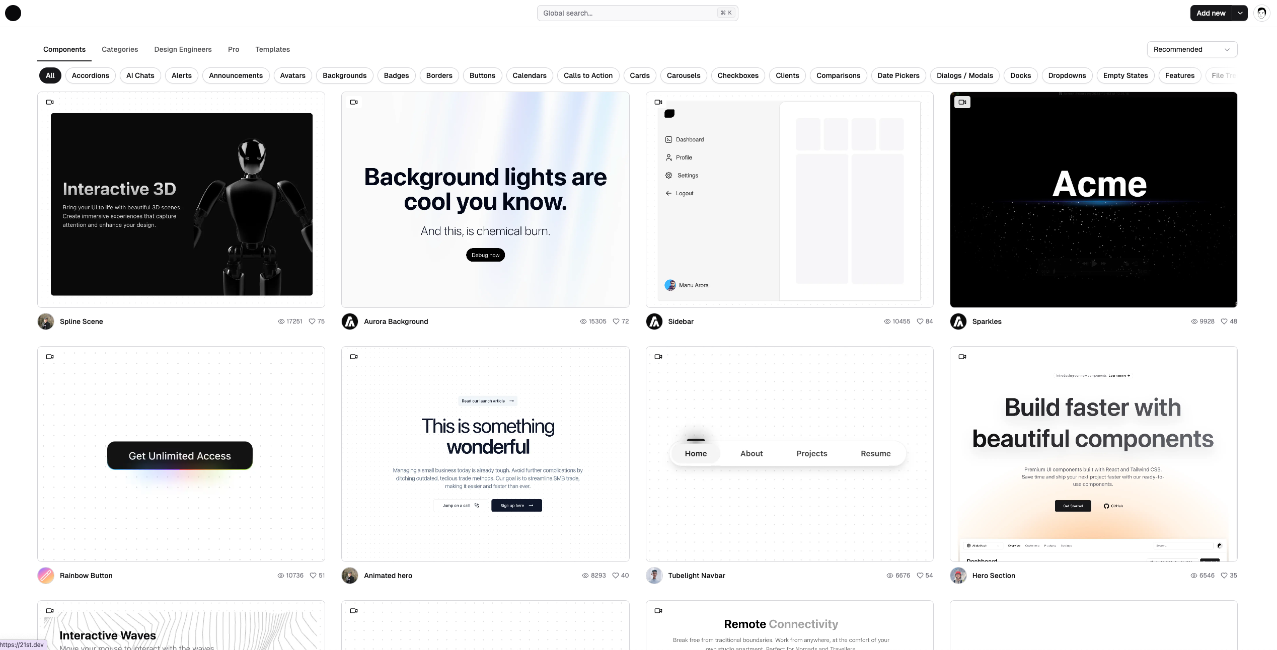 Here are some awesome examples built in Magic Patterns using components from 21st.dev:
